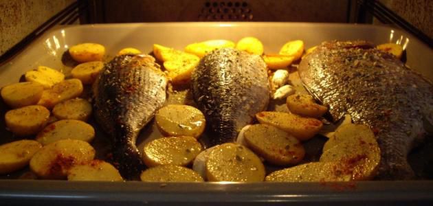 - ترصّ البطاطس في صينية الفرن مغلّفة بورق قصدير ثم يوضع السمك في وسطها ويسكب ما تبقى من التتبيلة على الوجه.